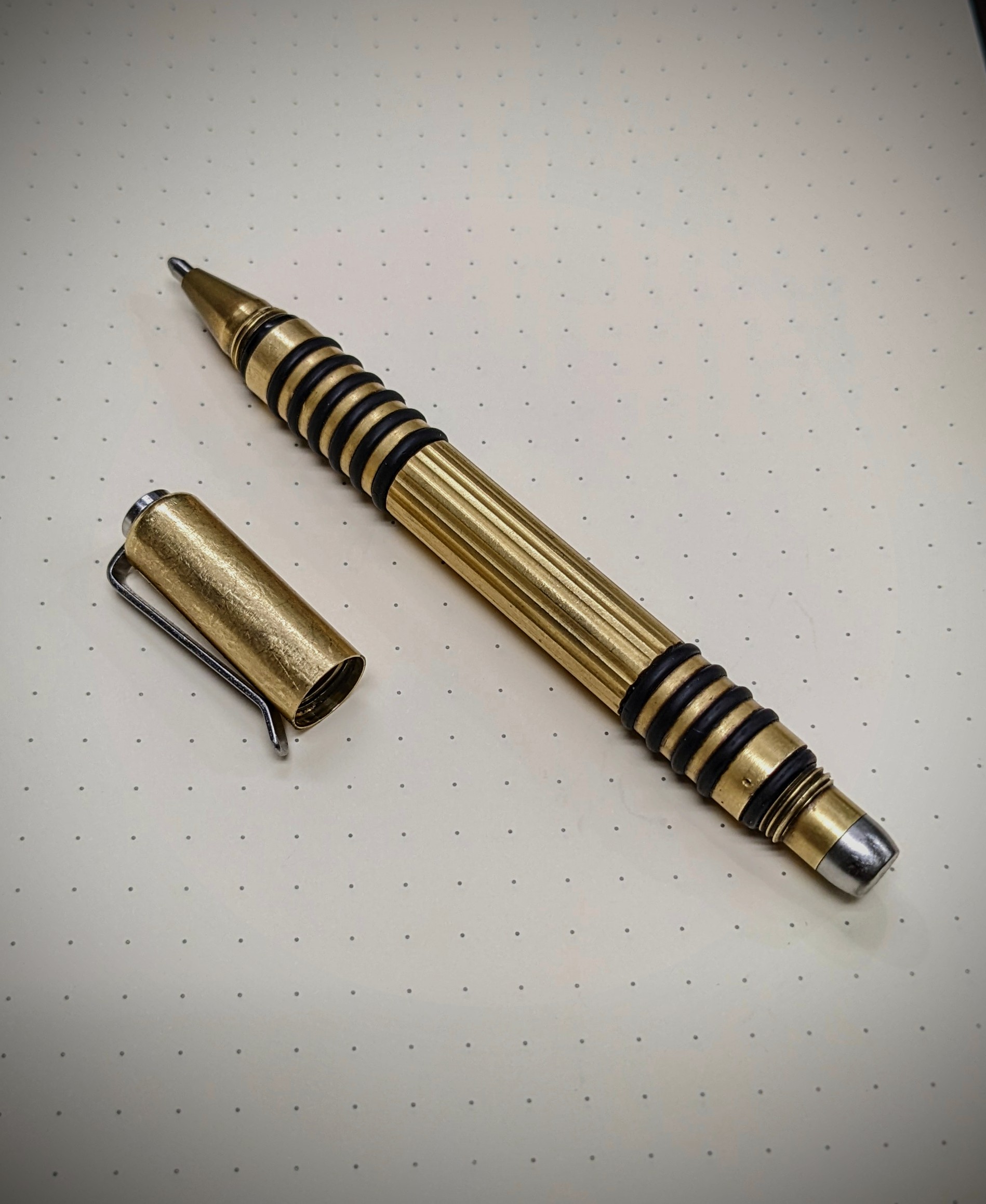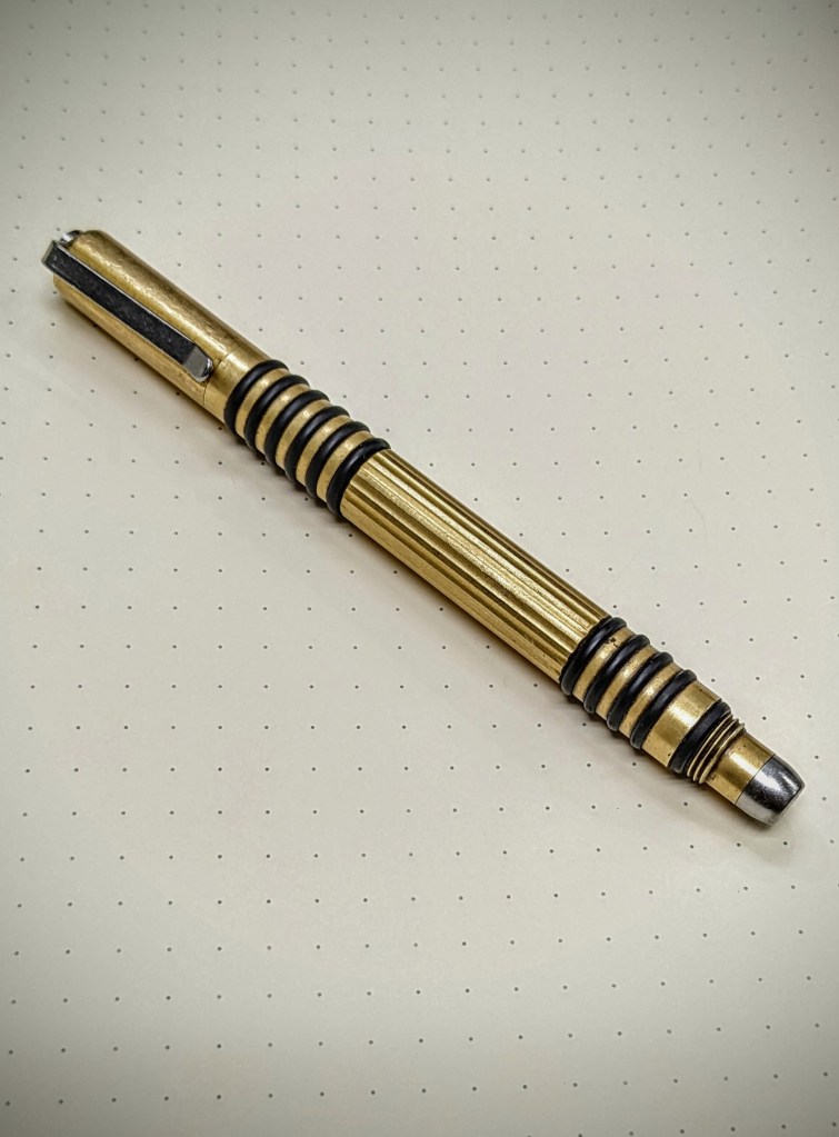 Made in the USA, measuring 4 1/2 inches long and made out of solid brass, the Investigator features deep grooves milled around the barrel of the pen. Included with the pen is an o-ring that could be installed at one end to secure the cap when it is screwed on to the body. With this I opted to buy more small o-rings to fill these milled grooves on the pen, as I found the corners too sharp for my liking and the o-rings provide a better grip when using the pen, plus i like the way it looks.