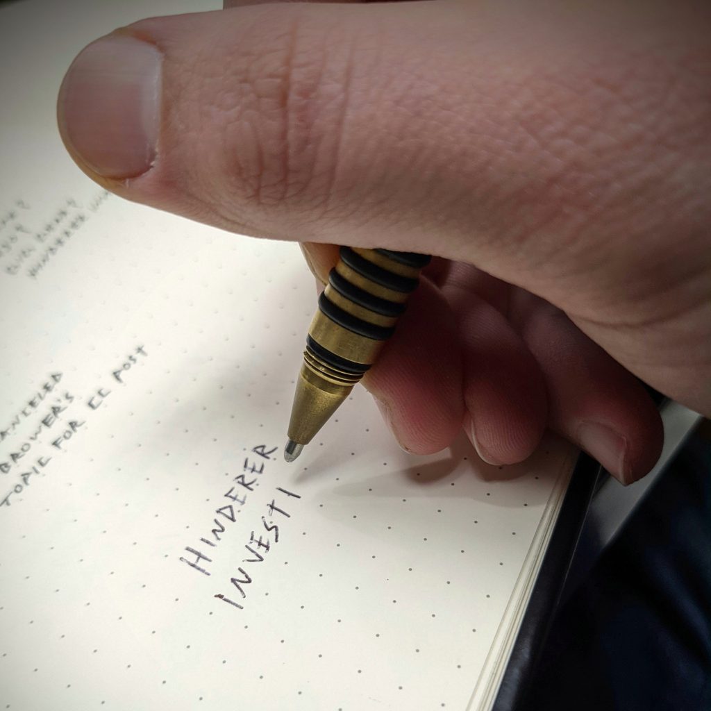 In late 2016 after losing two Fisher Space Pen bullets I set out on a mission to find an ink pen that I wouldn’t lose after a month of carrying. After searching various EDC websites and forums I finally landed on Rick Hinderer’s website and found the Hinderer Investigator Pen in brass.